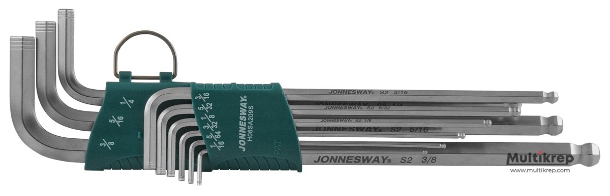 Комплект угловых шестигранников дюймовых серхдлинных H06SA209S изготовлен из стали S2\, имеет матовое хромоникелевое покрытие. Наличие шарового наконечника на длинной части инструмента позволяет дополнительно использовать инструмент под углом до 20град. к оси вращения крепежной детали.